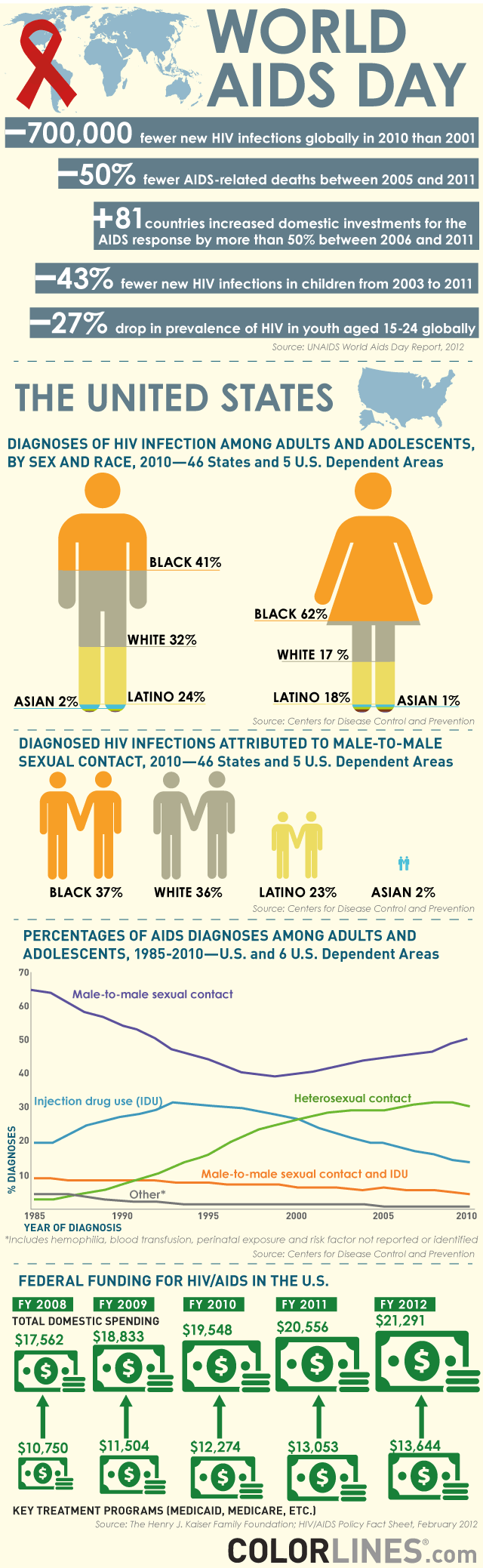 New HIV infections are coming in greatest number among black gay and bisexual men and black women due to sexual contact. However, the percentage of diagnoses involving injection drug use have been on the decline. Federal funding for HIV/AIDS has increased, but mostly because there are a growing number of people who need treatment in the Medicare and Medicaid programs.