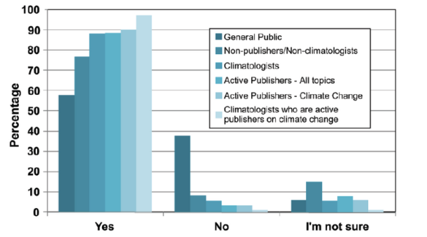 Above is the percentage of Americans that believe global warming is occurring. While most Americans agree that the planet is warming and it's our fault, the public is the most split on the topic.