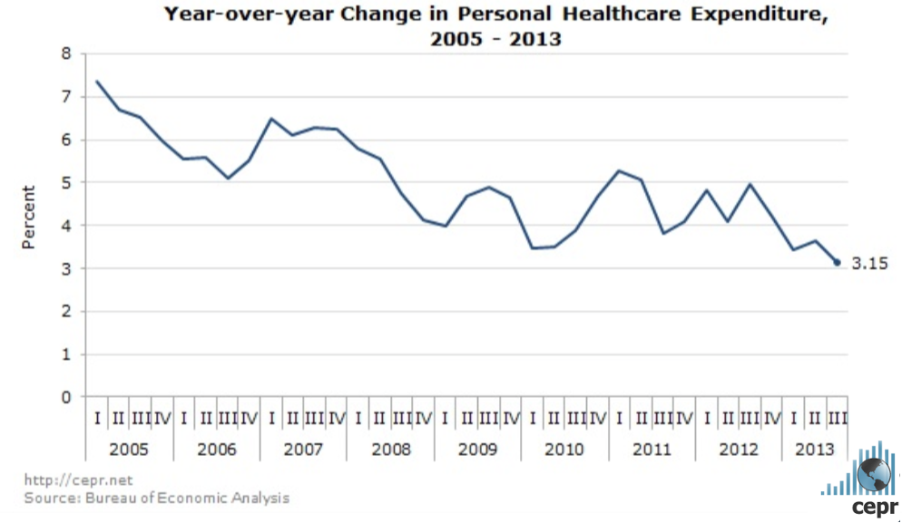 Measured as a share of nominal GDP, spending on health care services has actually fallen slightly over the last year. If this trend continues, it will eliminate most of the long-term budget shortfall when the Congressional Budget Office incorporates it into its projections.