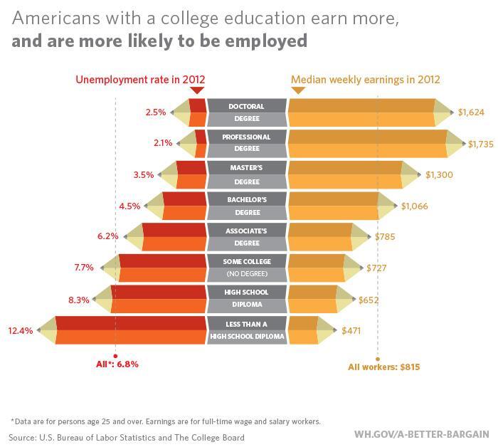 Americans with a college education earn more and are more likely to be employed. In 2012, those with an Associate's Degree or higher had an unemployment rate of 6.2%, compared to 12.4% among those with high school or less.