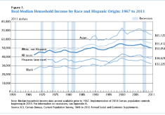 This chart compares the share allocated to selected expenditures by ethnicity and race for 2012. Black, non-Hispanics allocated more money to housing than white, non-Hispanics. However, white, non-Hispanics allocated more money to health care and entertainment.