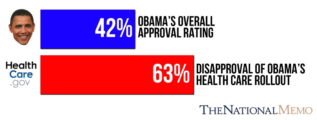 President Barack Obama’s approval rating has fallen sharply because of the botched launch of his signature health care plan, says a poll out Tuesday. His overall approval rating stands at 42% dropping six points in a month. Obama’s handling of the health care law’s rollout has a disapproval rating of 63%. Last month, 53% disapproved.