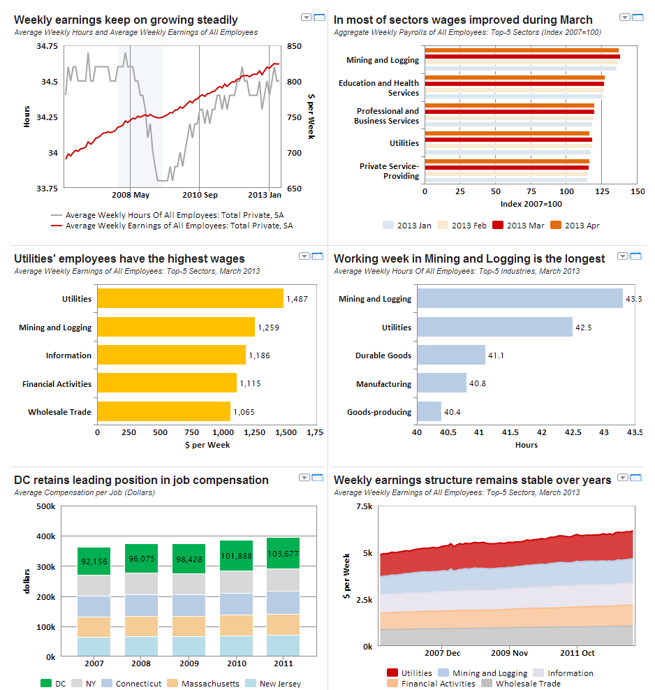 On the whole, labor compensation in the US retains stability over years. During the start of 2013 average earnings revealed moderate growth in major sectors. Utilities remains the sector with the highest weekly earnings levels, yet showing slight decrease in the March 2013. Concerning job compensation among states, District of Columbia is the most favorable one in these terms.