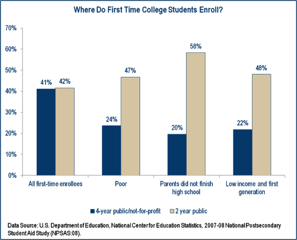 The first contact with higher education for most college-bound students from disadvantaged backgrounds is the local community college. While community colleges enroll about the same number of new students as 4-year colleges, they enroll a much higher proportion from less advantaged backgrounds: There is huge scope for improving mobility outcomes through the development of the community college system.