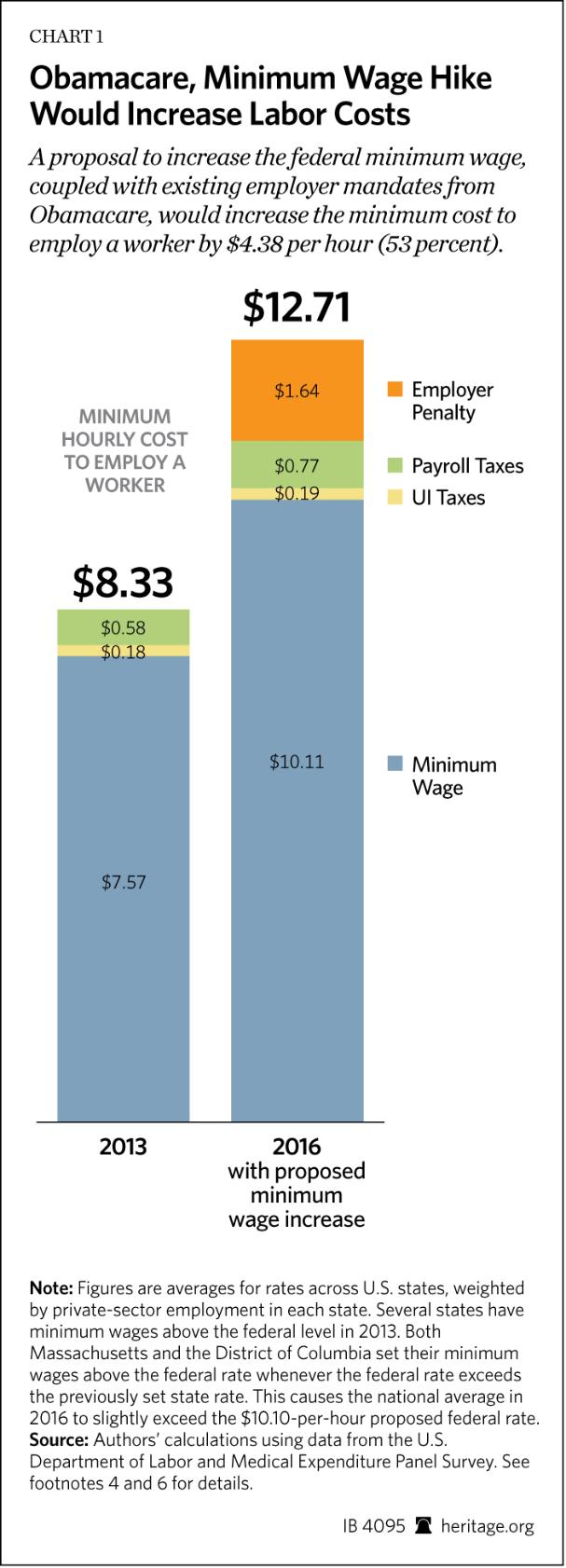 A proposal to increase the federal minimum wage, coupled with existing employer mandates from Obamacare, would increase the minimum cost to employ a worker by $4.38 per hour (53 percent).