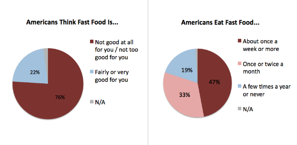This is definitely interesting. When making a comparison to stats from say 10 or 20 years ago. I would imagine after so much publicity and the hit documentary "Super Size Me," people have become more aware of how unhealthy fast food is and (hopefully) have reduced consumption. If you look at the gallup poll, numbers have actually moved in the direction of less fast food consumption. So although maybe something should be done to speed up the process the situation IS improving.