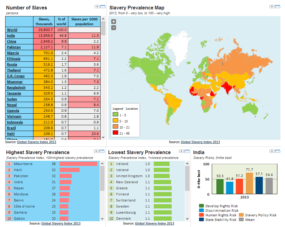 According to Walk Free Foundation there are an estimated 29.8 million people enslaved around the world. The countries with the highest numbers of enslaved people are India, China, Pakistan, Nigeria, Ethiopia, Russia, Thailand, Democratic Republic of Congo, Myanmar and Bangladesh. Taken together, these countries account for 76% of enslaved people around the world.