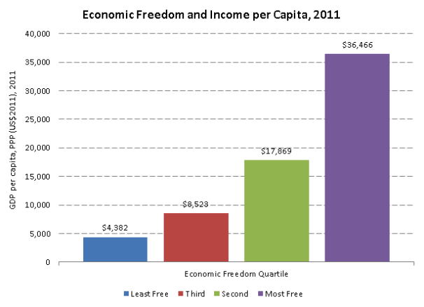There is a strong relationship between economic freedom and prosperity, as the countries in the top quartile of economic freedom are significantly richer than the rest. The average GDP per capita in U.S. 2011 dollars for the freest countries ($36,466) was more than eight times the average GDP per capita for the least free countries ($4,382).