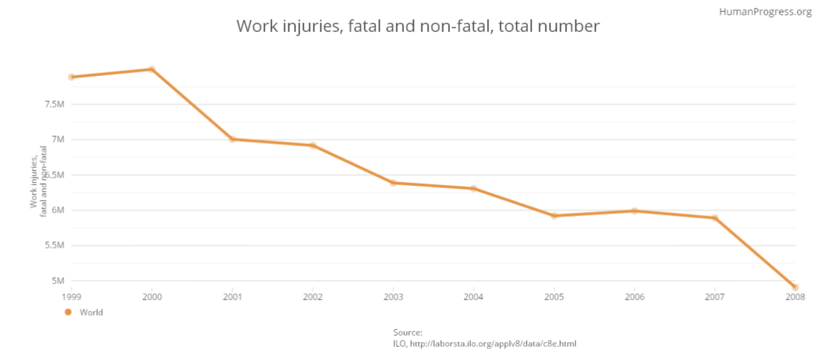 This chart covers work injuries throughout the world. As one can see, they are declining.