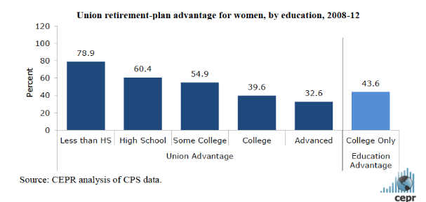 The union advantage for women is largest when looking at employer-provided retirement plans. Women in or represented by unions are 53.4 percent more likely to have pension coverage than those not in unions, which is also larger than the corresponding effect of a four-year college degree