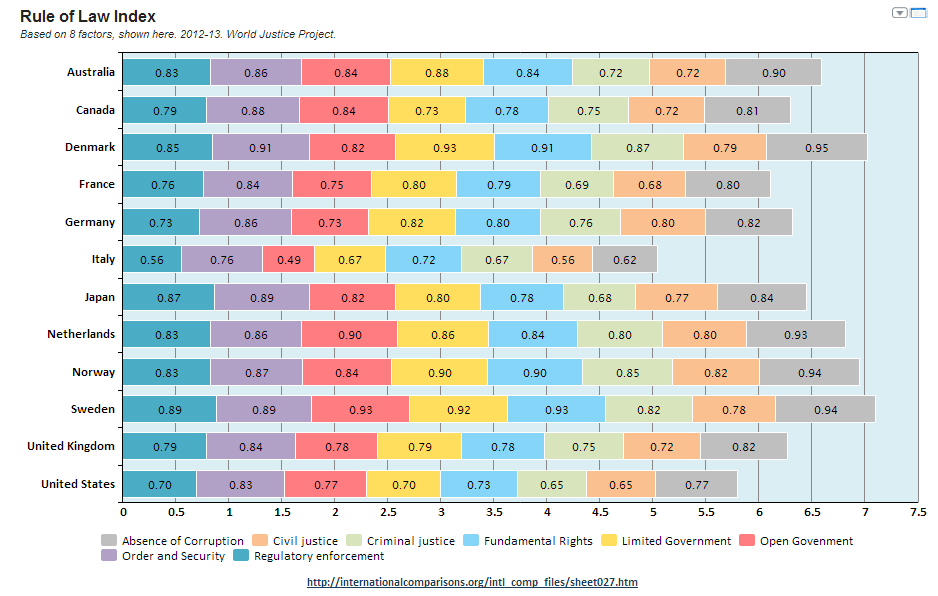 The World Justice Project report indicates that the United States is far behind other modern nations like Sweden and the Netherlands in maintaining a relevant and applicable rule of law among its government, the public, and other nongovernmental influences.