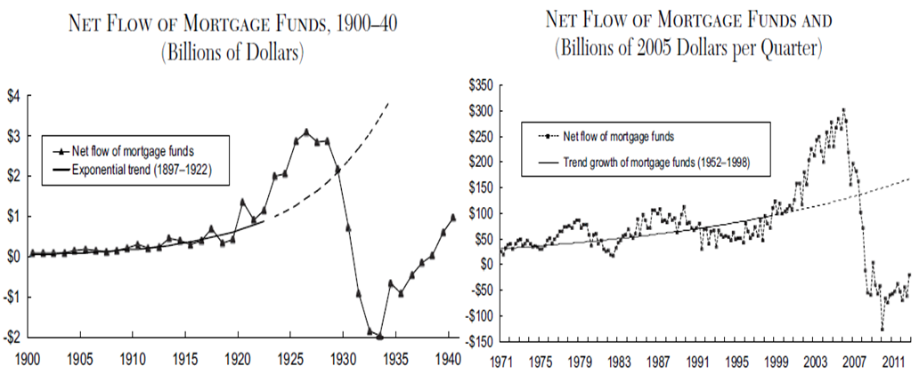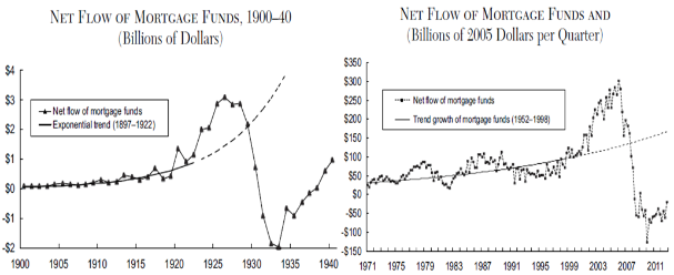 In the years preceding both the Great Depression and the Great Recession, the net flow of mortgage funds surged above the normal trend before the housing market collapsed and the net flow of mortgage funds sunk.