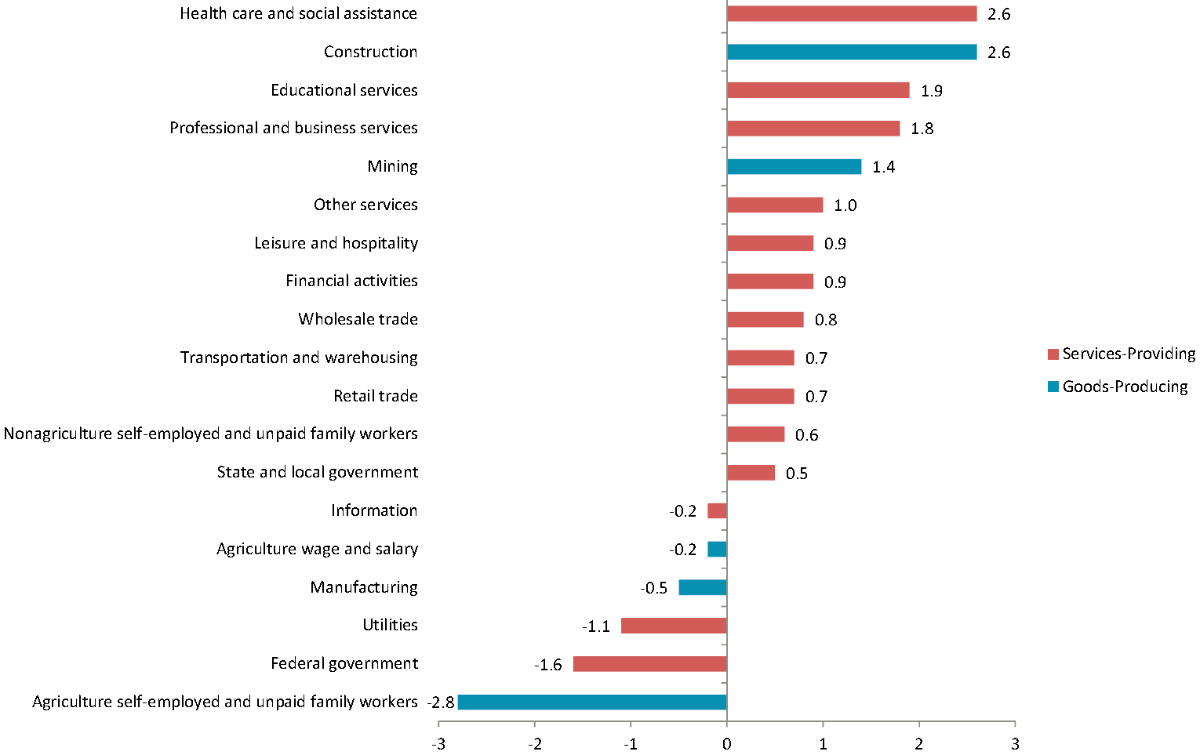 With the Affordable Care Act fully enacted, the health sector will show the highest increase in employment, matched only by the construction industry, both expanding 2.6%. The sequestration will effect a significant decrease in the number of federal employees. Traditional family agricultural production will continue to be replaced by that of large-scale corporate-backed producers, who dominate most agriculture-related industries.