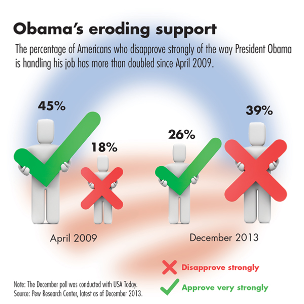 Gallup and ABC News/Washington Post polls show that President Obama's five-year average approval rating is its lowest on record. Virtually all major pollsters show a substantial drop in his approval rating throughout 2013. The president has lost substantial ground on many leadership qualities. Three-quarters called him a strong leader in February 2009; only half give that response today.