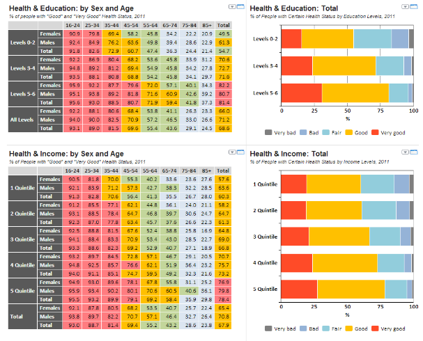 Only 55% of people with low education level perceive their health status as “good” and “very good”. At the same time 81% of population with high education level has good and very good health. The same is for income: the share of healthy people grows by almost 20% with the increase of income level from 1st to the 5th quintile.