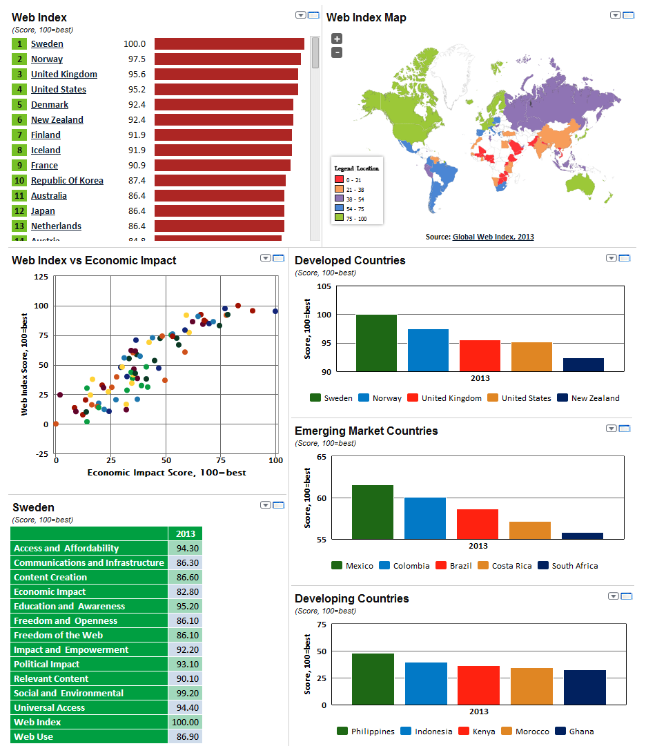 Designed and produced by the World Wide Web Foundation, the Web Index is the first multi-dimensional measure of the World Wide Web’s contribution to development and human rights globally. It covers 81 countries, incorporating indicators that assess the areas of universal access; freedom and openness; relevant content; and empowerment.