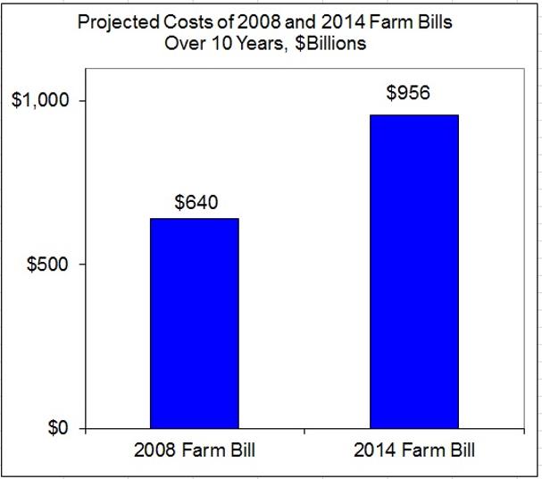 The House of Representatives has officially passed a $956 billion farm bill. The farm bill trims $16.5 billion from expected spending of $956 billion over the decade, just 1.7%. However, the 2014 farm bill is not a cut when compared to the 2008 farm bill, which was projected to cost $640 billion over 10 years. That's a 49% spending increase.