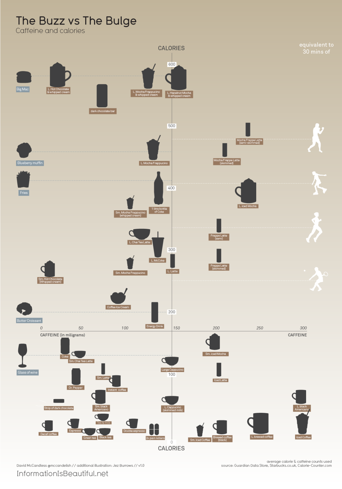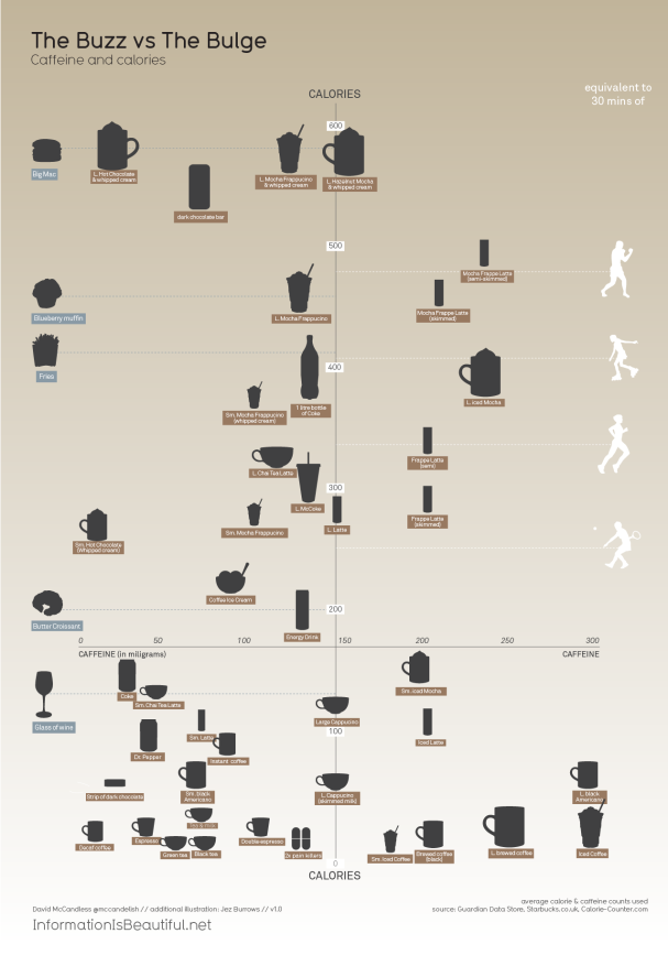 Are you consuming a quick pick-me-up or a liquid meal? A great look at the caffeine content compared to calories of every day food and drink. One of my favorite charts from graphic designer David McCandless on his site Information is Beautiful.