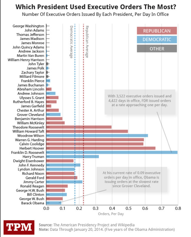 As the chart above shows, Obama has been downright thrifty in issuing executive orders by historical standards. His 168 executive orders come out to less than 0.1 for every day he's been in office.