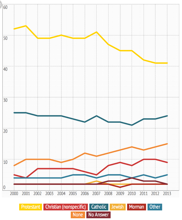 While Judaism, Catholicism and Mormonism stay relatively consistent, Protestantism is on the downfall while a lack of religion is increasing. This begs the question: what is causing this?