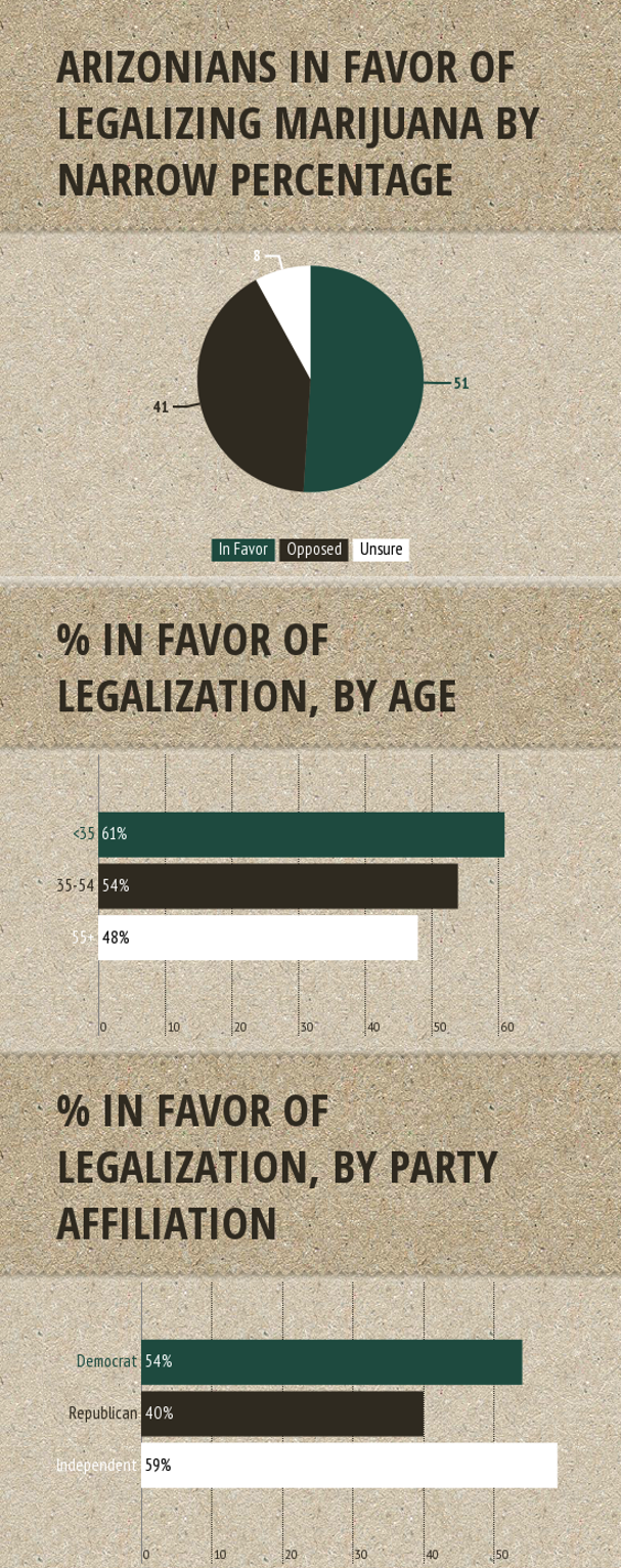 "Two groups are trying to collect enough signatures to put the issue on the ballot in Arizona, with one aiming for this year and the other for 2016." However, "Maricopa County Attorney Bill Montgomery said in an email that the margin for error indicates that there are more people opposed to legalization than the poll suggests."