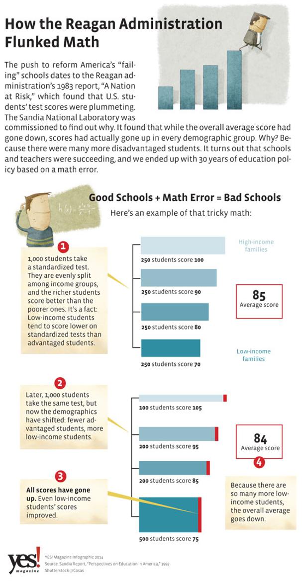 In 1983, President Reagan's National Commission on Excellence in Education issued “A Nation At Risk,” a report that declared, “the educational foundations of our society are presently being eroded by a rising tide of mediocrity.” That report was wrong, and it paved the way for school standardization and privatization. Read more about "The Myth Behind Public School Failure" here: bit.ly/1jmjl7u