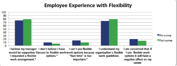 After the National Workplace Flexibility Study, employees felt more comfortable requesting flexibility although participating organizations’ policies didn’t change during the study, and employees did not participate directly in the study. The shift may have been due to increased manager awareness and comfort in dealing with flexibility, and involvement in flex team blueprints which encouraged managers to discuss flexibility with teams.