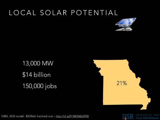 According to the Institute for Local Self-Reliance, 21% of Missouri's power could come from rooftop solar energy. And that could mean big numbers for the state's economy: $14 billion in economic activity and 150,000 jobs. That's why Missourians say "show me solar!"