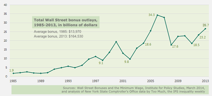 In 2013, the New York State comptroller reported last week, Wall Street banks handed out over $26 billion in bonuses to some 165,200 financial industry executives and staff. That total would be enough to more than double the compensation for the 1,085,000 Americans who work full-time at the current federal minimum wage of $7.25 an hour.