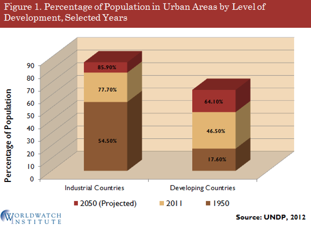 The trend of urban population growth outpacing rural growth is expected to intensify in the future. Given that 82% of the world lives in developing countries, the chart reflects that the developing world is projected to add approximately 2.45 billion people to its cities by 2050 while the industrial world is due to add just 170 million.