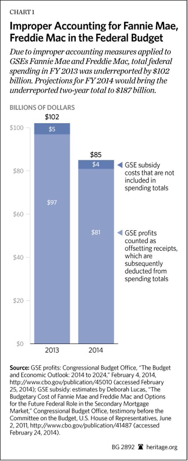 Due to improper accounting measures applied to GSEs Fannie Mae and Freddie Mac, total federal spending in FY 2013 was underreported by $102 billion. Projections for FY 2014 would bring the underreported two-year total to $187 billion.