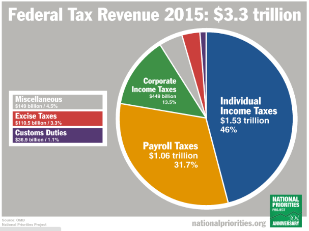 This is how President Obama proposes collecting $3.34 trillion in tax revenue in fiscal year 2015. Tax revenue will cover 84 percent of total spending. The rest – 16 percent – will come from borrowing.