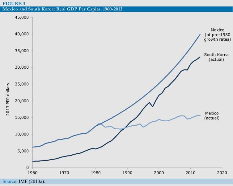 Although Mexico's economy was on the right track, neoliberal economic policies that began in the 1980's - and then NAFTA, implemented in 1994 - greatly affected its progress. Arguments that Mexico's pre-'80s growth was unsustainable are challenged by the comparison made here. Had such policies not been adopted, per capita GDP would be close to Spain's and France's.