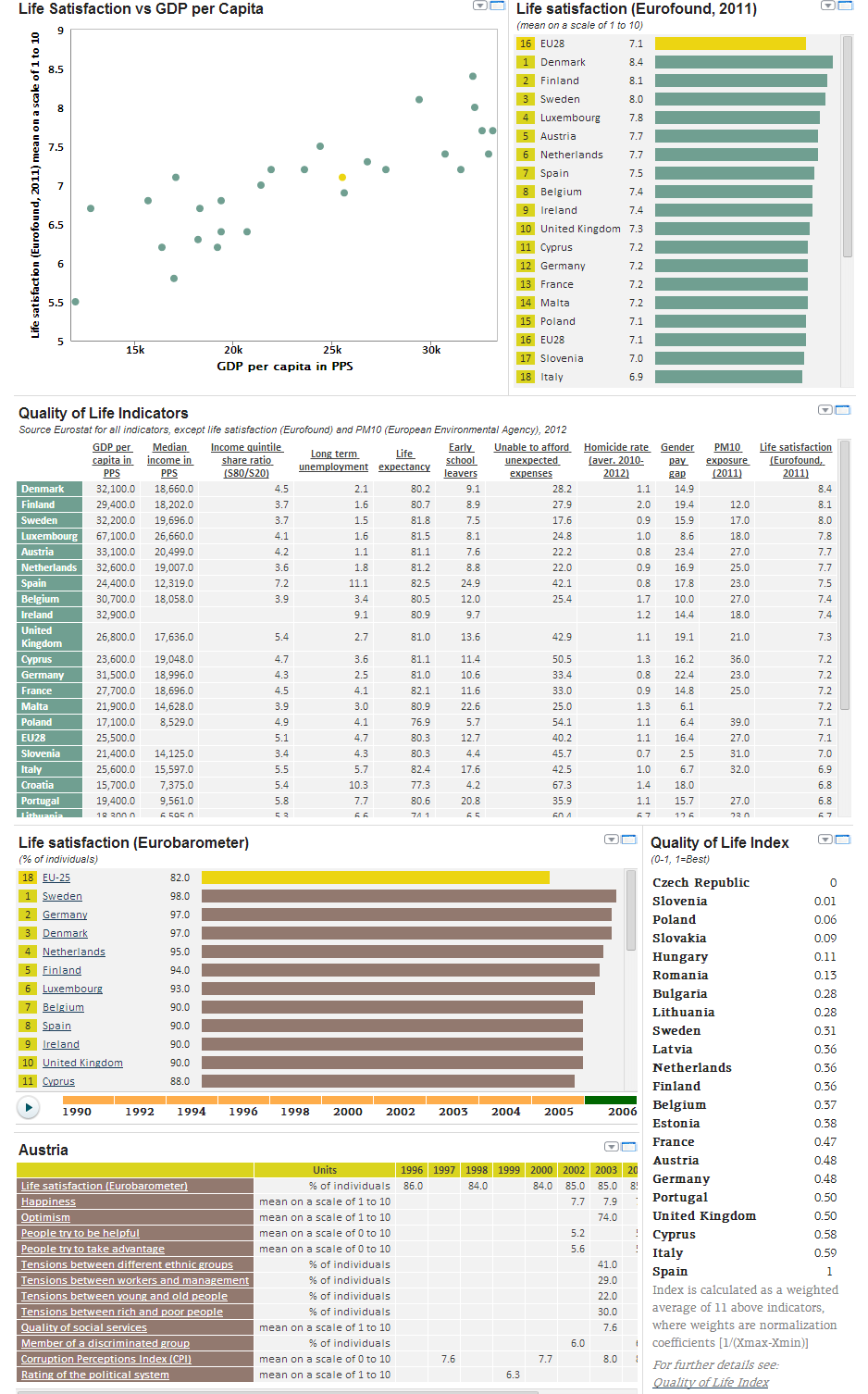 Today it is agreed that life satisfaction is important complement to the traditional measures of quality of life, such as GDP per capita. To fully catch the quality of life, economic wealth should be considered simultaneously with social and environmental well-being, which jointly define "gross global happiness". Dashboard presents indicators measuring the quality of life in the EU.