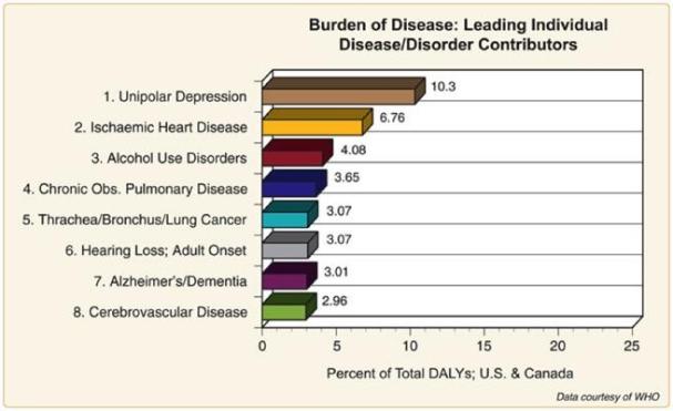 The World Health Organization (WHO) estimates show the leading individual diseases and disorders that contribute to total number of DALYs. Depression is number 1!