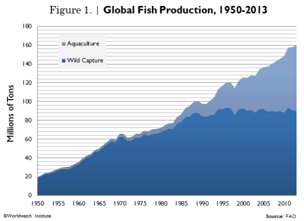 Wild capture has stagnated since the mid-1990s, reflecting the fact that many regional fisheries are at or even above their maximum sustainable catch levels. Aquaculture now accounts for 44 percent of total fishery output (and for 49 percent of fish meant for direct human consumption), up from 8 percent in 1984.