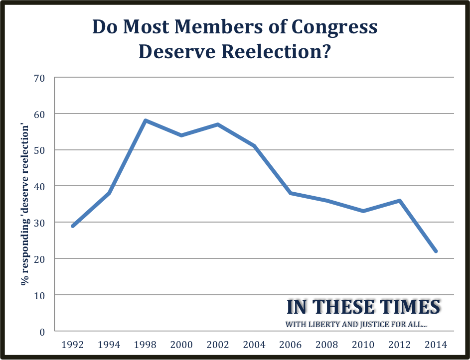 Americans' satisfaction with Congress is reflected in a sharp drop in the percent of the electorate that believe most incumbents 'deserve' reelection: from a high of 58% in the late 1990s, it has fallen to just above 20% for the 2014 midterm season. Read the Article to see how anti-incumbent sentiments are shaking things up at the state level.