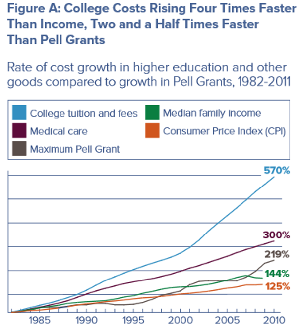 Over the last three decades, college costs have increased nearly four times faster than median family income. Financial aid has not filled the growing gap, and “unmet financial need”—the share of college costs not covered by financial aid or what the family is expected to contribute—has risen sharply.