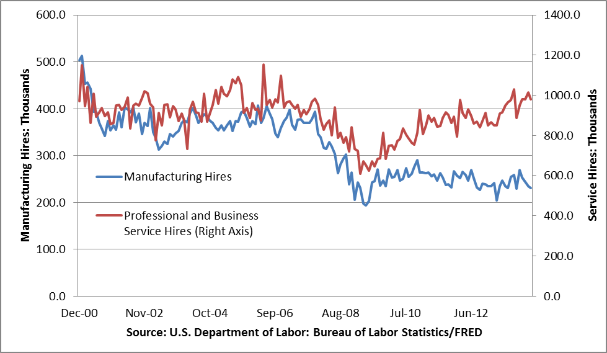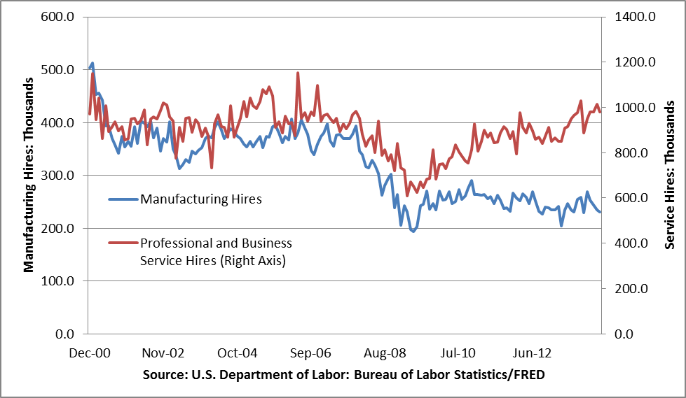 Manufacturing has been the back bone of the American labor force since Industrialization. But with technological advancement and outsourcing, the manufacturing industry is seeing a reduction in hires. Inversely, professional and business services are experiencing an influx of hires. This may indicate a shift in need for more skilled labor and a desire for cheap, foreign assembled goods.