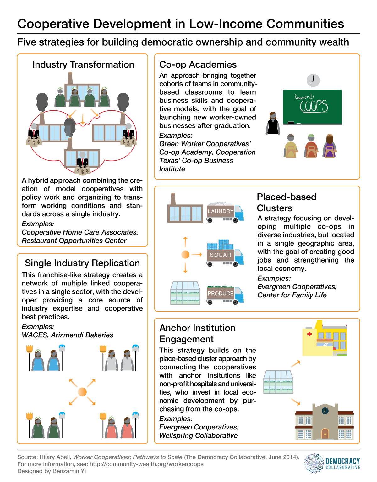 Worker cooperatives are an important part of the community wealth building toolbox. A new report by Democracy Collaborative assesses the state of worker cooperative development in the United States and suggests key strategies and policies for scaling up its impact. These five developmental strategies include industry transformation, coop academies, single industry replication, placed-based clusters, and anchor institution engagement. Read more.