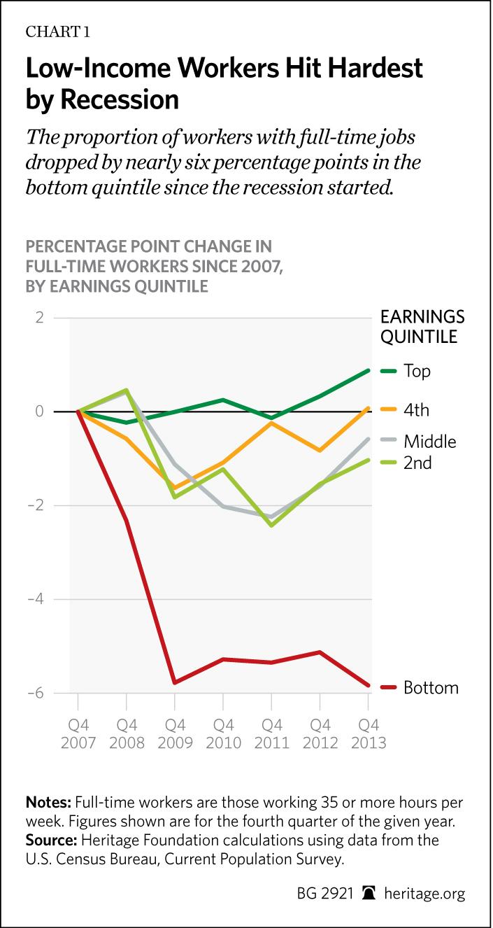 The proportion of workers with full-time jobs dropped by nearly six percentage points in the bottom quintile since the recession started.