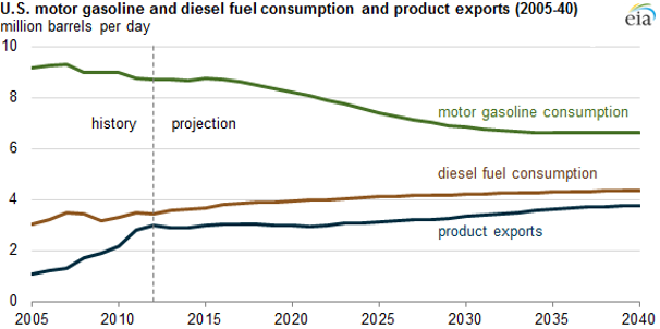 As fuel economy standards are becoming more stringent, the EIA has projected a decline in the consumption of motor gasoline through the year 2040. These projections are a reflection of current laws and policies that have been issued. However, future changes in efficiency standards and travel behavior may result in future fuel use differing from this current projection.