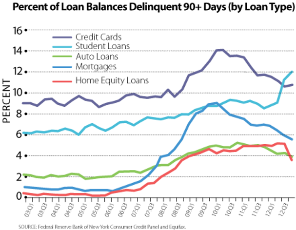 For the 5 largest U.S. debt totals, credit cards have traditionally shown the highest delinquency rates. Yet in 2012, rapidly growing student loan debt has stolen the number one spot and claimed the highest delinquency rate, with no indication of slowing. Since 1Q 2012, 4 of 5 major debt categories have been declining in delinquency, while student loans have increased.