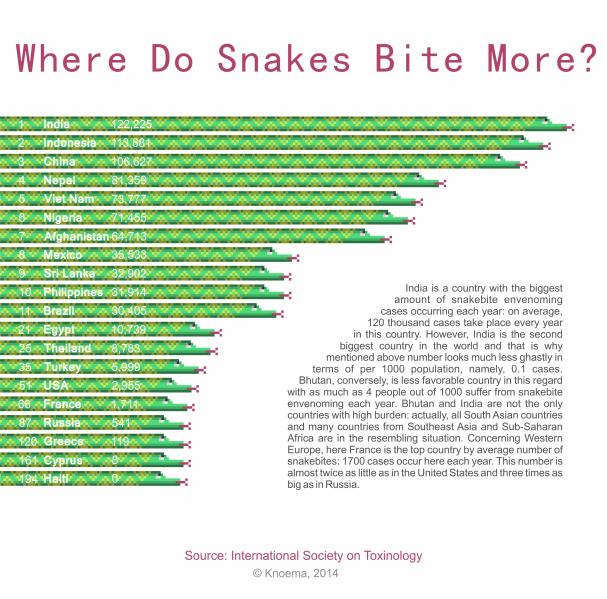 India is a country with the biggest amount of snakebite envenoming cases occurring each year: on average, 120 thousand cases take place every year in this country. However, India is the second biggest country in the world and that is why mentioned above number looks much less ghastly in terms of per 1000 population, namely, 0.1 cases.