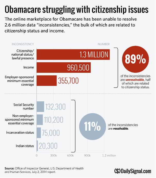 The online marketplace for Obamacare has been unable to resolve 2.6 million data "inconsistencies," the bulk of which are related to citizenship status and income.