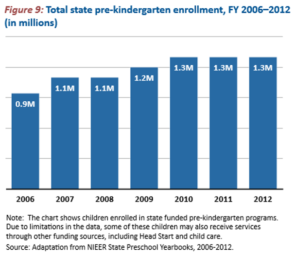 In 2012, 40 states operated pre-kindergarten programs. Total state pre-kindergarten spending steadily increased from 2006 to 2010, with the largest increase in spending ($900 million) occurring between 2007 and 2008, and the only decrease in spending ($400 million) from 2011 to 2012.
