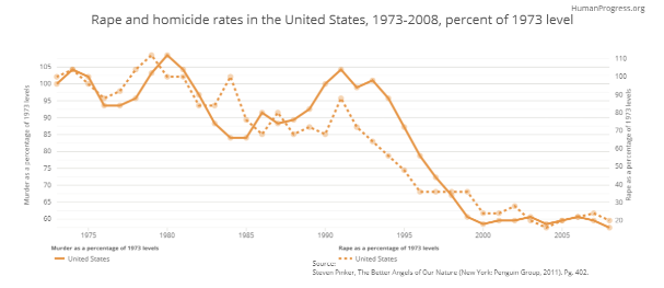 Many Americans hold the false notion that violent crime is on the rise in the US. That perception, though, couldn't be further from the truth. Since 1973, the rates for both homicide and rape in the United States have decreased substantially: falling about forty and eighty percent, respectively.