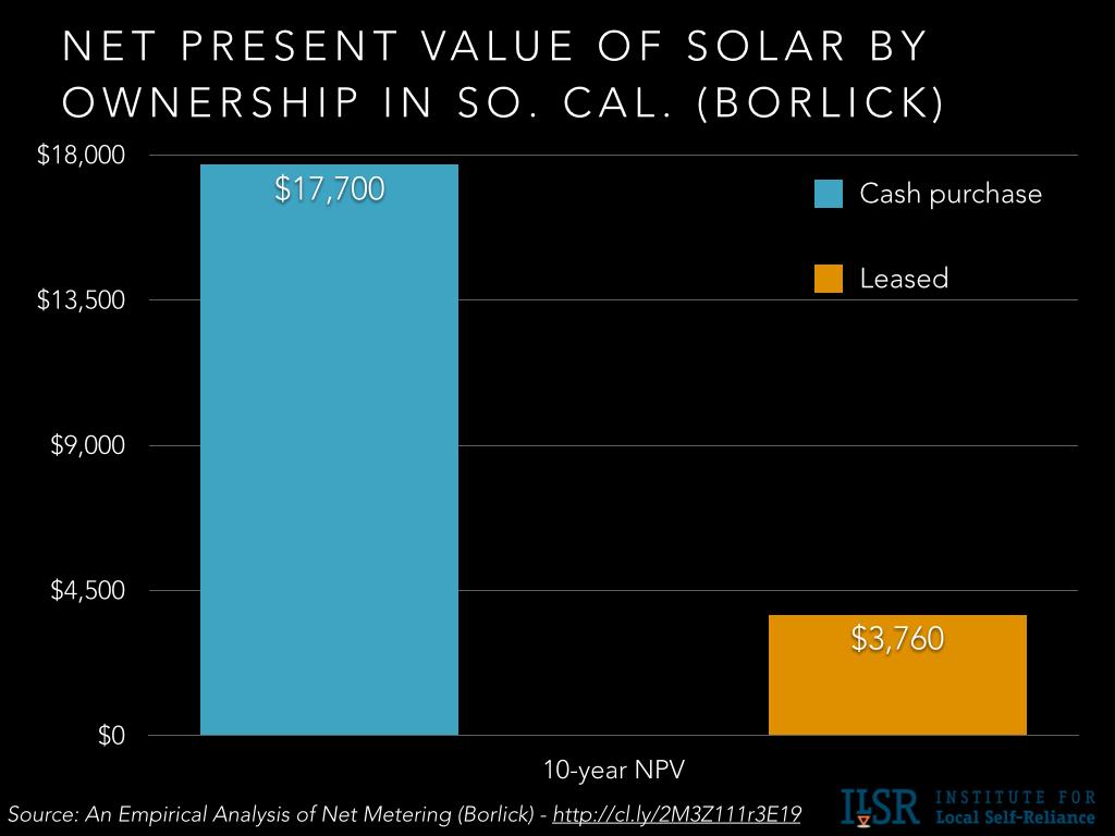 Robert Borlick of Harvard’s Electricity Policy Group finds that in Southern California, solar homeowners give up 80% of their project’s value over the first 10 years by opting for a lease. Solar leasing has helped the residential solar market grow significantly, but in the years ahead we foresee a surge back toward solar ownership. More: www.ilsr.org/solar-ownership-…