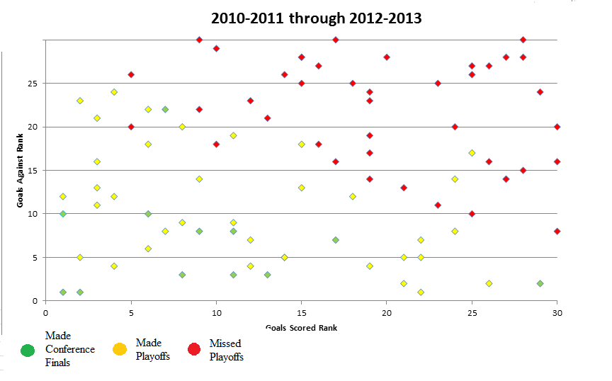 The chart represents how successful each NHL team is based on their goal allowed and goal scored rankings from the 2010-2011 season through the 2012-2013 season. A red diamond represents a team that missed the playoffs. A yellow diamond represents a team that made the playoffs. A green diamond represents a team that made it to their respective conference finals.