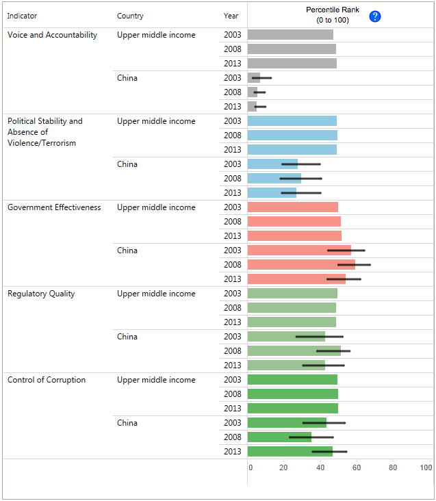 The middle income trap. What is it? Basically it's when a country cannot make the transition from a upper middle income economy ($4,125 GNI Per Capita, World Bank) to a high income economy ($12,746 GNI per capita, World Bank). To understand the theory practically, a few countries in the trap are; Brazil, Malaysia, Argentina and the Philippines. A few countries who made the transition are Japan, South Korea and Taiwan. The question is, will China fall into the trap? This is something debated highly debated by economists, in part because of the variety of ways to calculate the boundaries of the middle income trap. The fact is, it exists, and we know this because of the stagnation upper middle income countries experience before they make the transition. There are a number of indicators worth considering such as, savings rate % of GDP, Investment rate % of GDP, manufacturing value added % of GDP, trade patterns (what exactly countries export), income inequality, infrastructure and governance. It is governance I would like to talk about today, it seems in our world today almost everything is quantifiable and made economically relevant, even governance. As seen in the graph on average the other upper middle income countries outperform China's government on all but effectiveness (which isn't surprising due to the absolute lack of red tape in China). This becomes interesting and relevant because on many other indicators mentioned above, China outshine their fellow upper middle income countries by a considerable margin. This is of course not surprising because economically China are driving forward with some serious urgency. But where will the lack of transparency leave them in terms of bridging the gap to become a high income economy? I say it won't have a dramatic effect, despite the bad rep China's government gets, if they had an election tomorrow, they would almost definitely win. Although a censoring communistic government has a hell of a lot of downsides, the fact is, they have helped China become the powerhouse it is today. Would love to hear some thoughts on the challenges China face in the future, things like income inequality, climate change and the ability to begin to manufacture highly technological exports are all blockades for China, the question is, will it simply hinder them or actually prevent them becoming a high income economy?